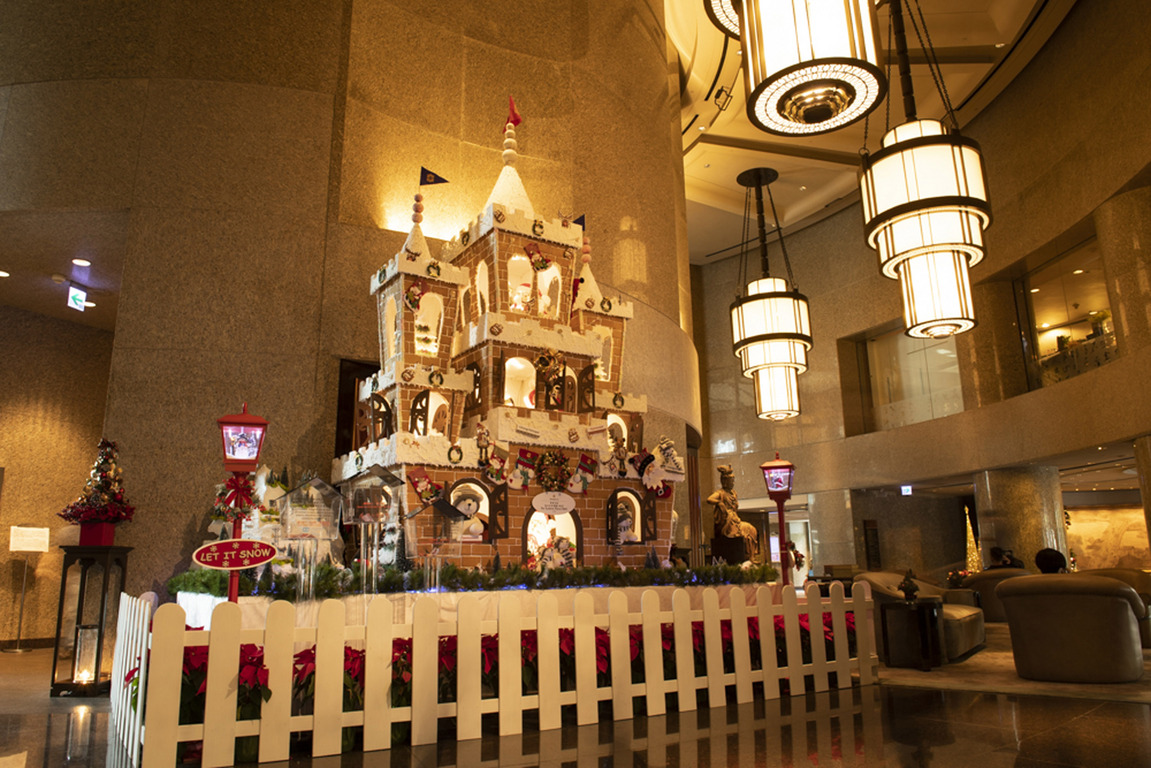 香格里拉台北遠東大飯店則是使用超過 3800 片薑餅、50 公斤麵粉、25 公斤糖霜製成高達 6 公尺的耶誕城堡,由 10 多位甜點師傅拼貼薑餅布置,城堡周圍還有經典的歐洲老火車穿梭白雪靄靄的山脈。