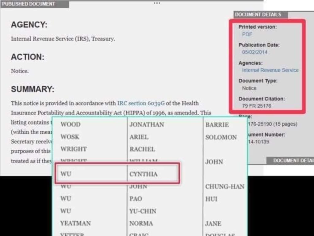 根據美國財政部國稅局的資料,2014 年第一季放棄國籍的名單,有位叫 Cynthia Wu。吳欣盈的英文名字剛好叫 Cynthia。