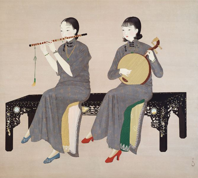 拿著具有臺灣特色的曲笛和月琴,畫中的女性以傳統審美的五官,搭配摩登的西式捲髮。灰藍底金紋高叉旗袍,內襯不同顏色的褲裝以及紅色高跟鞋,加上身上的首飾,顏色素雅又在各處充滿華麗細節,更結合了臺、日、中的文化元素在其中。
