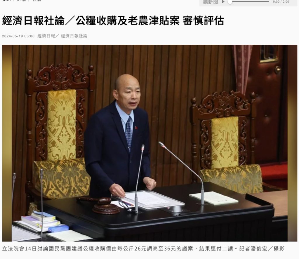 國會近日爭議的法案除了花東交通條例、國會藐視罪、財政劃分法,跟農業最相關的,是國民黨要推動的「公糧收購價由每公斤 26 元調高至 36 元的議案,結果是逕付二讀,並交付黨團協商,以及將老農津貼由目前每月 8,110 元提高至 1 萬元。」
