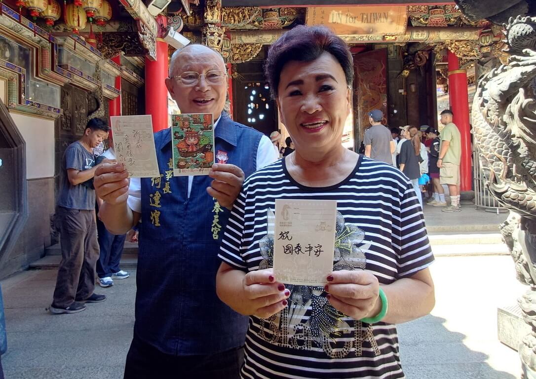 何達煌表示,9 月 6 日至 8 日新港媽祖將到綠島海巡、賜福綠島,今天起在新港奉天宮發放限定綠島潛水明信片,民眾寫上姓名、地址和想表達的話語,廟方將協助投寄綠島海底郵筒,再從海底撈出後寄到指定地址,數量有限送完為止。