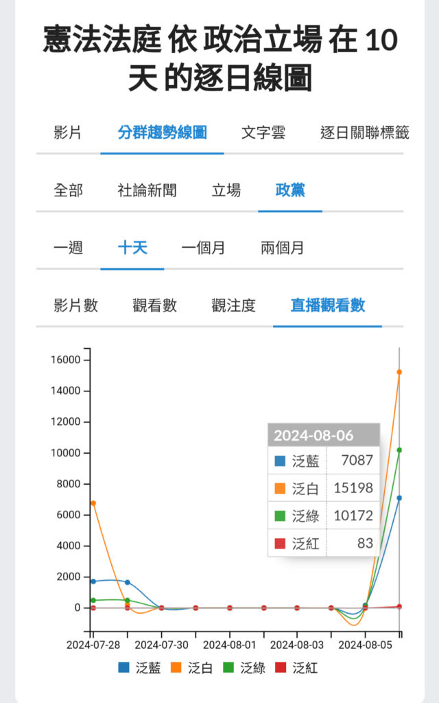 憲法法庭昨日進行言詞辯論,以「憲法法庭」為關鍵字,觀察四大政治意識型態陣營直播對憲法法庭的關注程度。可以發現,泛白小草圈的直播最關心憲法法庭,其次是泛綠、泛藍第三,泛紅漠不關心。