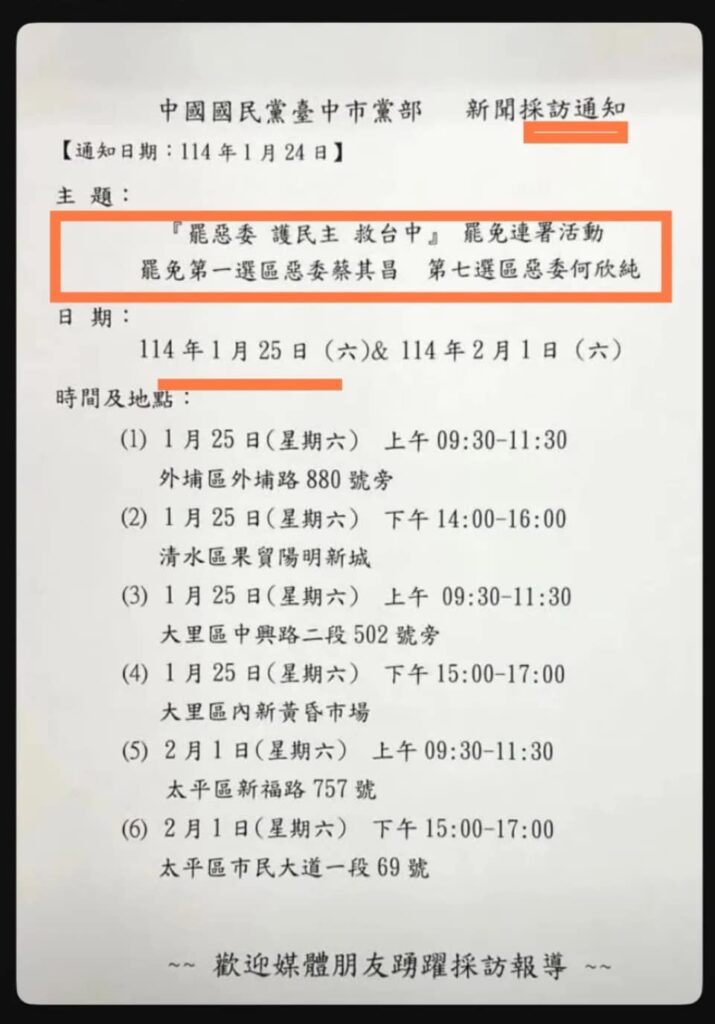 更不用說,國民黨應該思考反省的是,自己明明已經展開以政黨之力(如台中市黨部的採通),發動罷免民進黨立委的反制連署行動,為什麼沒有同比例的民眾買單?這才是問題之所在。