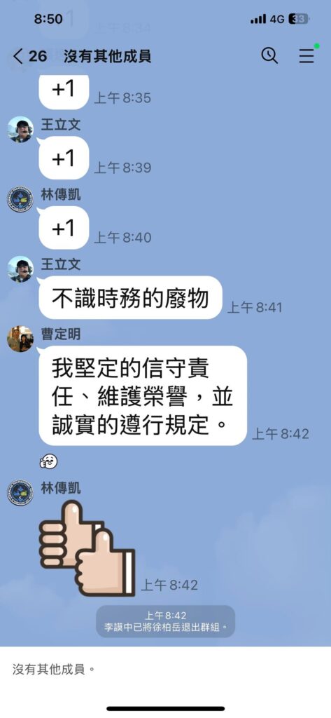 針對飛官 Line 群組裡的舔共現象,鷹爸徐柏岳在新台派上線節目上說:「恐懼使人自甘為奴!」