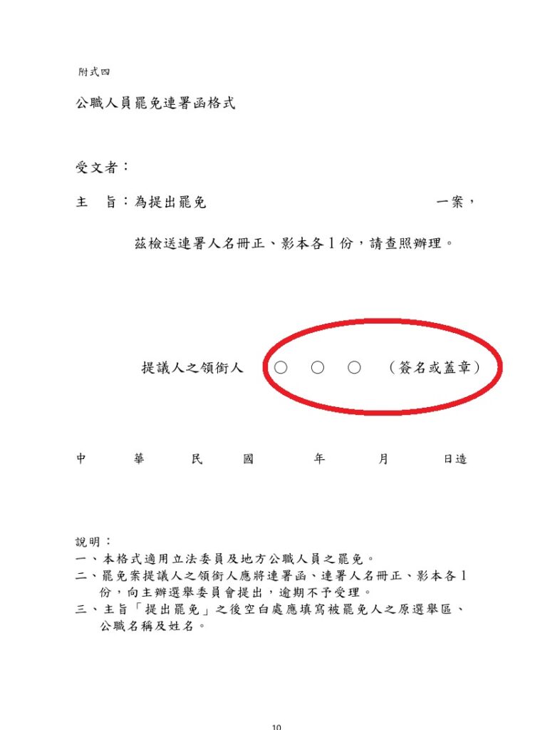 張克晉不在、沒換領銜人卻送件。記得嘉義罷陳冠廷的案件,領銜人說他被冒用;但中選會出面表明,確實有委託書。且罷免連署函必須領銜人簽章,到時候上面的簽章只要不符,就是偽造文書。