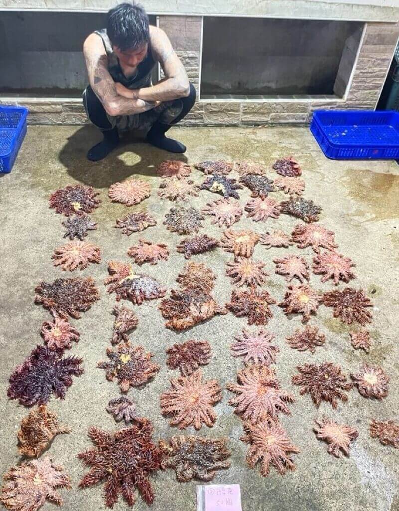 澎湖水域遊憩活動公會理事長陳中行表示,公會成員連日來,日夜潛水進行移除作業,短短 1 個星期,今天代為收購大小不一的棘冠海星 180 隻,由於棘冠海星具有毒性,所移除的棘冠海星採乾濕分離,將送中研院與水試所澎湖漁業生物研究中心作為大法螺的飼料。