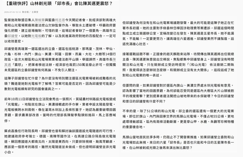 然後這篇特稿列舉邱議瑩關切自己選區內各種光電議題,就是沒管到和山光電案,因為是忙著要選高雄市長;還無視選區內另個規模更大的馬頭山光電案。