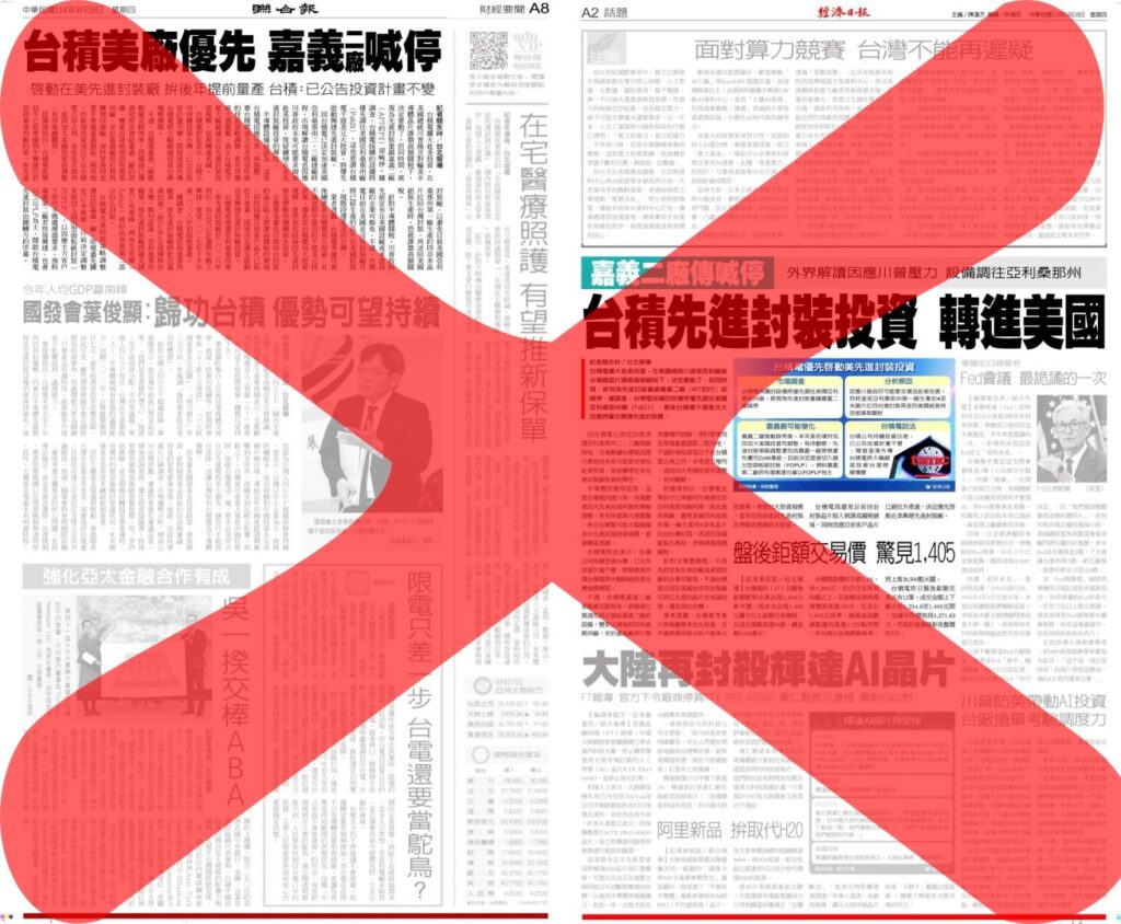 分享 聯合報造假新聞試圖影響上市公司股價 金管會不查? 聯合報、經濟日報昨公然造假新聞,稱台積電喊停嘉義二廠。由於台積電是上市公司,任何訊息都會影響市場交易,更何況是開盤前的報紙新聞?台積電也馬上駁斥這是假新聞,強調在台投資不變。面對這種毫無天良、只想唱衰台灣的垃圾假新聞,金管會還要裝聾作啞嗎? 圖片來源:曾韋禎臉書 原文出自曾韋禎臉書,芋傳媒經授權轉載。 假新聞台積電嘉義二廠經濟日報聯合報金管會 分享 FacebookGoogle+電子信箱LINELinkedinTelegram