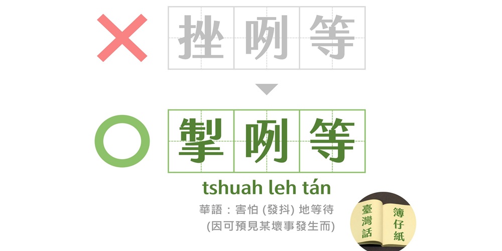 過去拙文曾解釋台語進行式介詞「咧leh」只是借音字,本字是「著」,唸teh,口語相傳訛變為leh,如「剉咧等」和「坐咧食」,本字分別是「掣著等tshua teh tan」和「坐著吃tse teh tsia」,這裡「著」是華台共用的進行式介詞,同字同義,華語唸zherㄓㄜ,台語依轉音規則轉讀teh,訛變為leh(咧)。