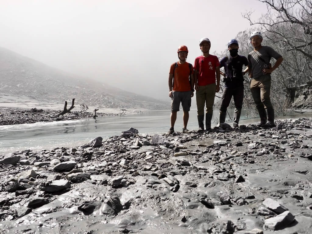 張光承說, 10 月5日上午9時 40 分左右到達湖區,回報完畢後合影,同時觀察到湖旁的森林線,底下的樹林曾經是泡在水裡的,崩塌後全都覆蓋一層灰白色粉塵,已然成為「死亡森林」,樹木腐朽酸味瀰漫在樹林間。