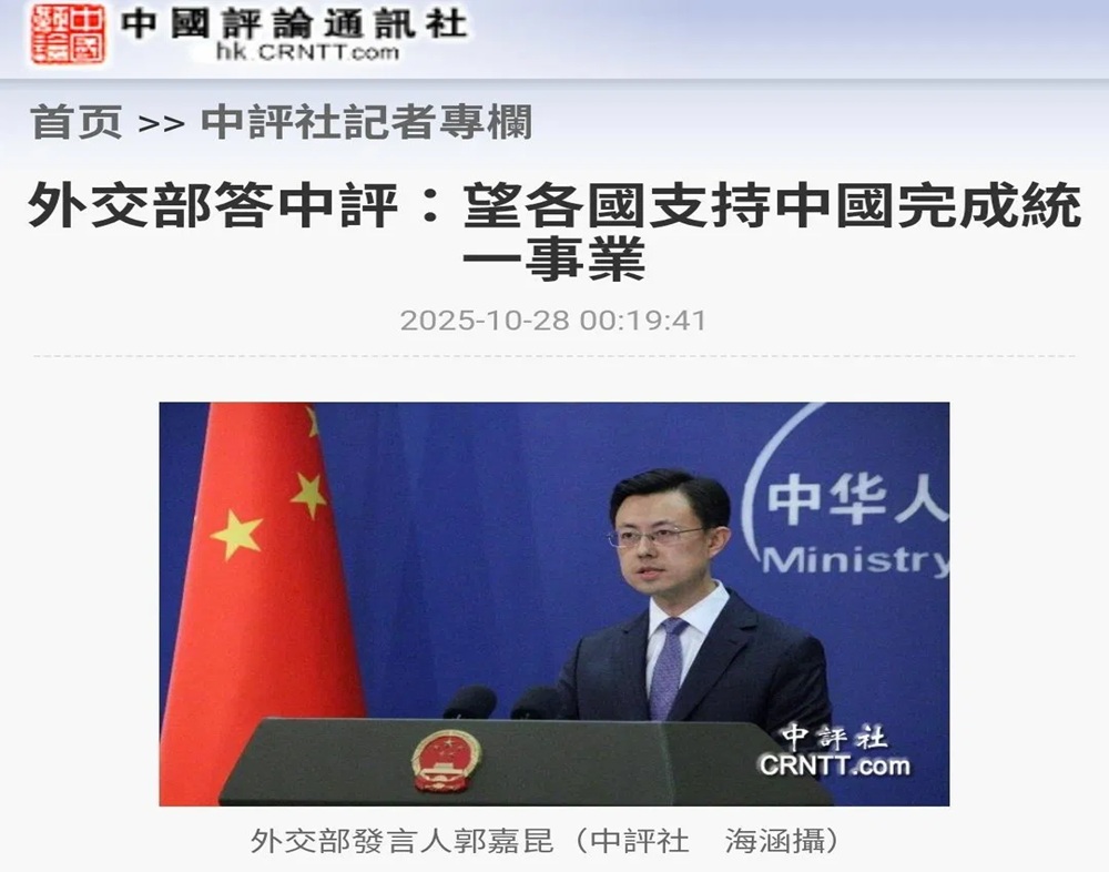 於是,中國外交部發言人郭嘉昆在10月27日例行記者會居然說,設立台灣光復紀念日,展示了全國各族人民堅持一個中國原則、捍衛國家主權和領土完整的堅定立場。希望各國支持中國人民反對「台獨」分裂活動、完成國家統一的正義事業(註2)。讓人不禁要懷疑,郭嘉昆是不是唸錯稿了?
