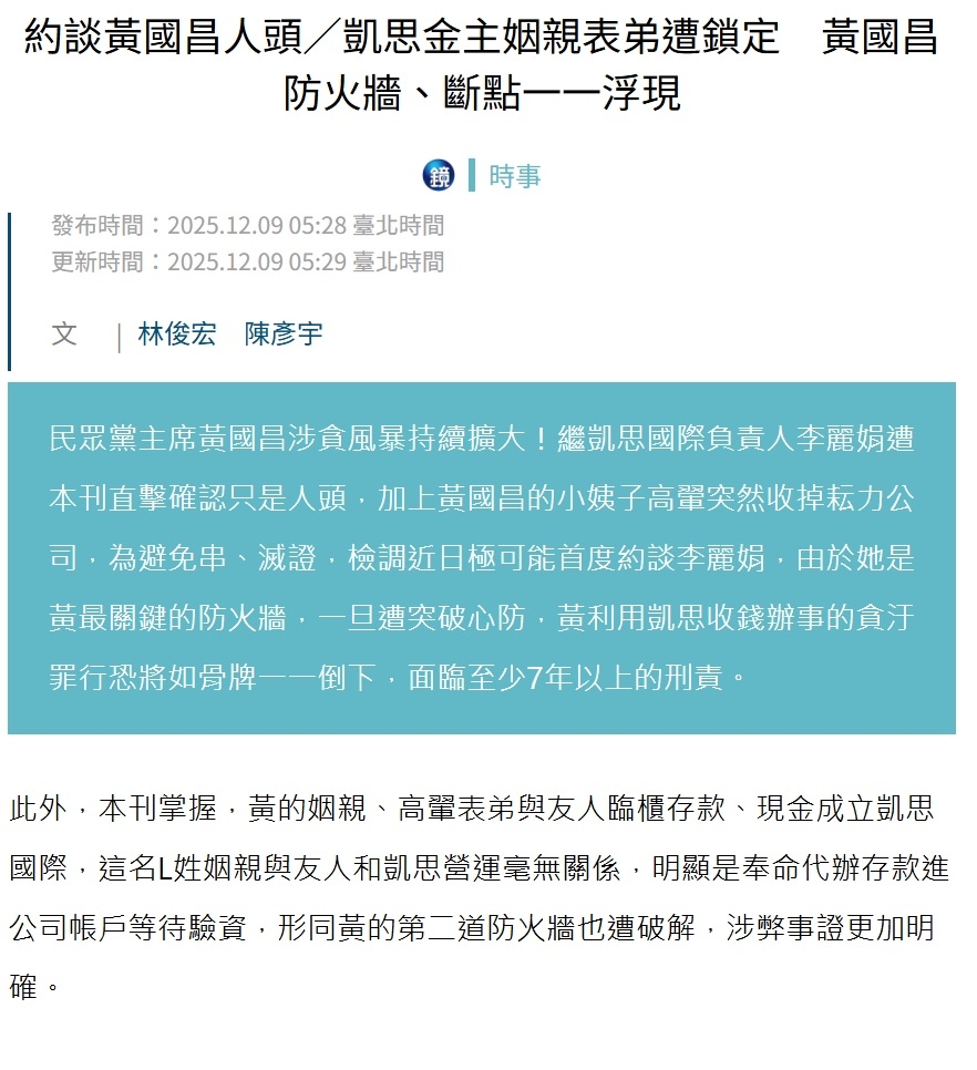 分享 黃國昌的太太表弟是否為賴以強? 今日週刊重點是,除李麗娟,還另有人頭為高翔L姓表弟與友人,他們透過臨櫃存款、現金成立凱斯國際。 我知道高翔姑姑的兒子賴以強曾任黃國昌助理,是高翔派去監視黃國昌別偷吃的;賴以強的父母賴尚煜、高熙玟都在原能會,但因仕途不順,黃國昌當年還藉故對原能會窮追猛打。 圖片來源:曾韋禎臉書 原文出自曾韋禎臉書,芋傳媒經授權轉載。 凱斯國際助理原能會李麗娟賴以強賴尚煜高熙玟高翔 分享 FacebookGoogle+電子信箱LINELinkedinTelegram