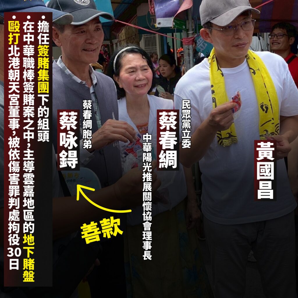 而他的姊姊蔡春綢,前幾天剛上任立委。她是中華陽光推展關懷協會理事長,而此基金會在兩年前曾被爆料,其收款帳戶的戶名為黃美蘭,黃美蘭就是蔡咏鍀的太太。