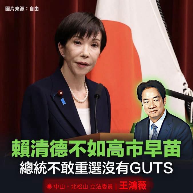 王鴻薇在「脆」貼了一張圖卡,上面只有兩行字:「賴清德不如高市早苗 總統不敢重選沒有GUTS」(見附圖)。